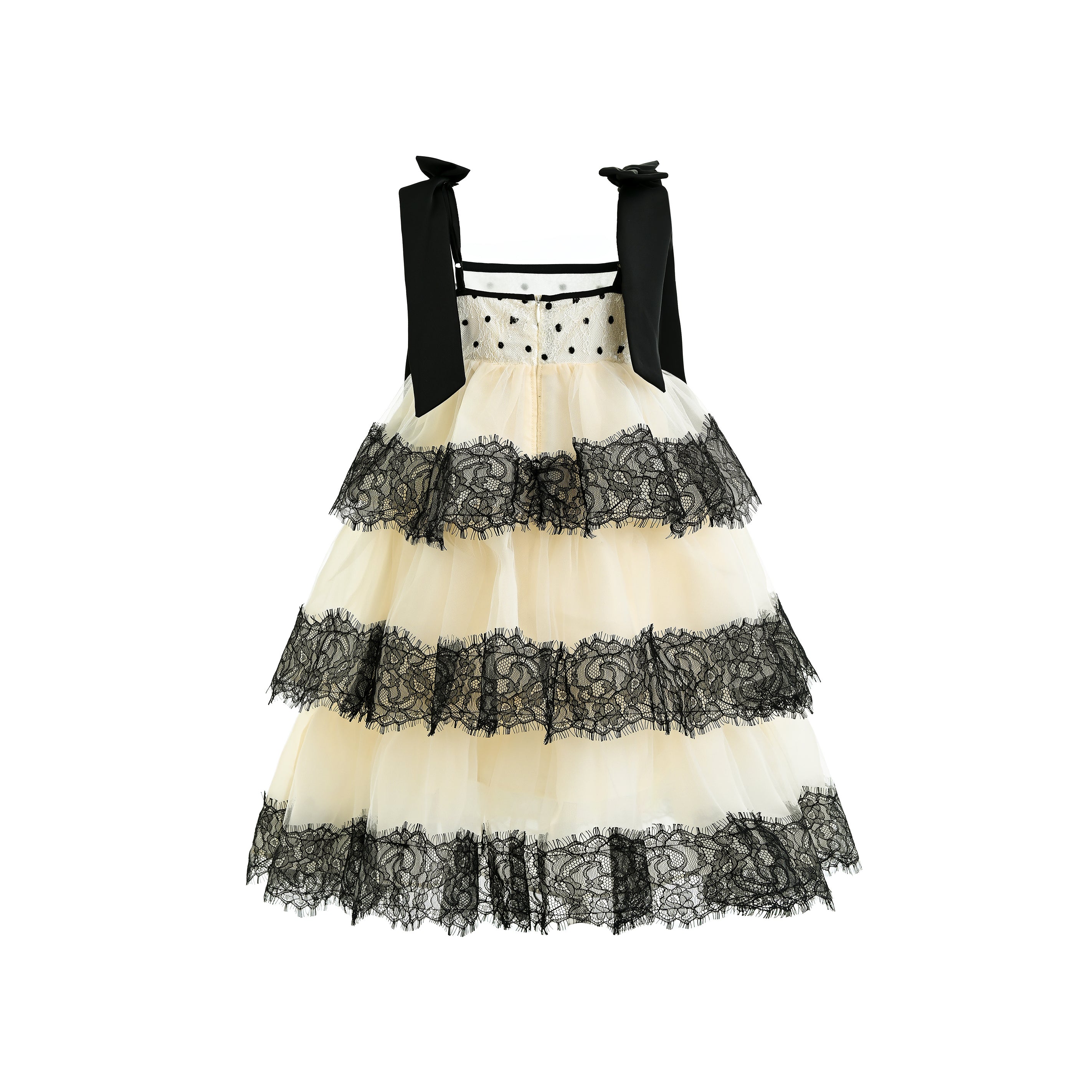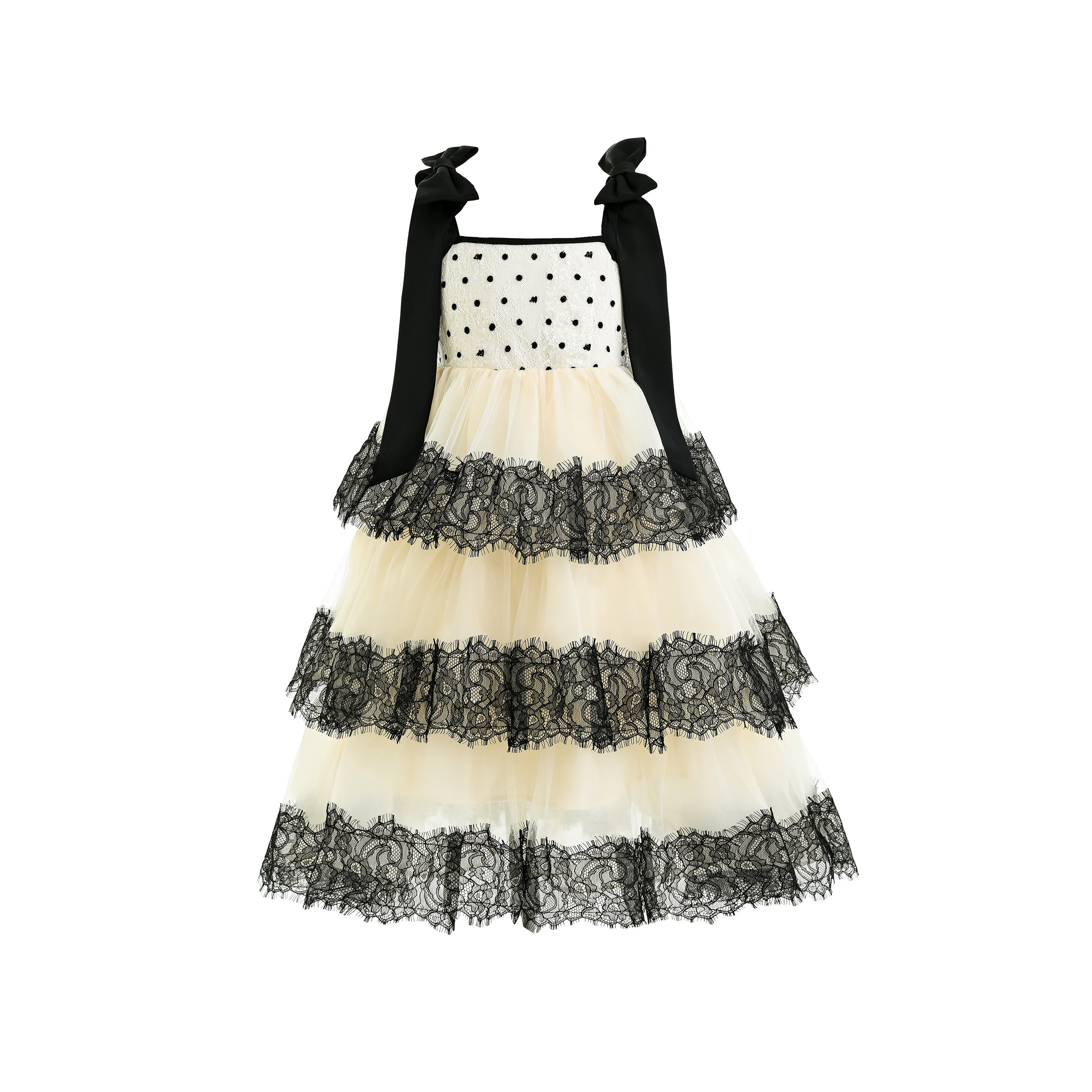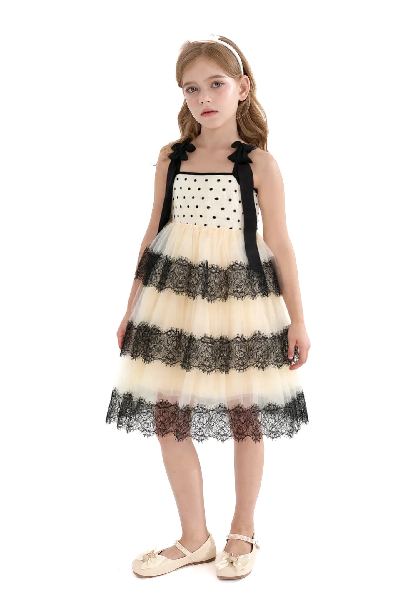 The ivory polka dot sleeveless bow dress for kids is a delightful blend of charm and comfort. Made from soft, breathable fabric, this dress features playful black polka dots on an elegant ivory base.