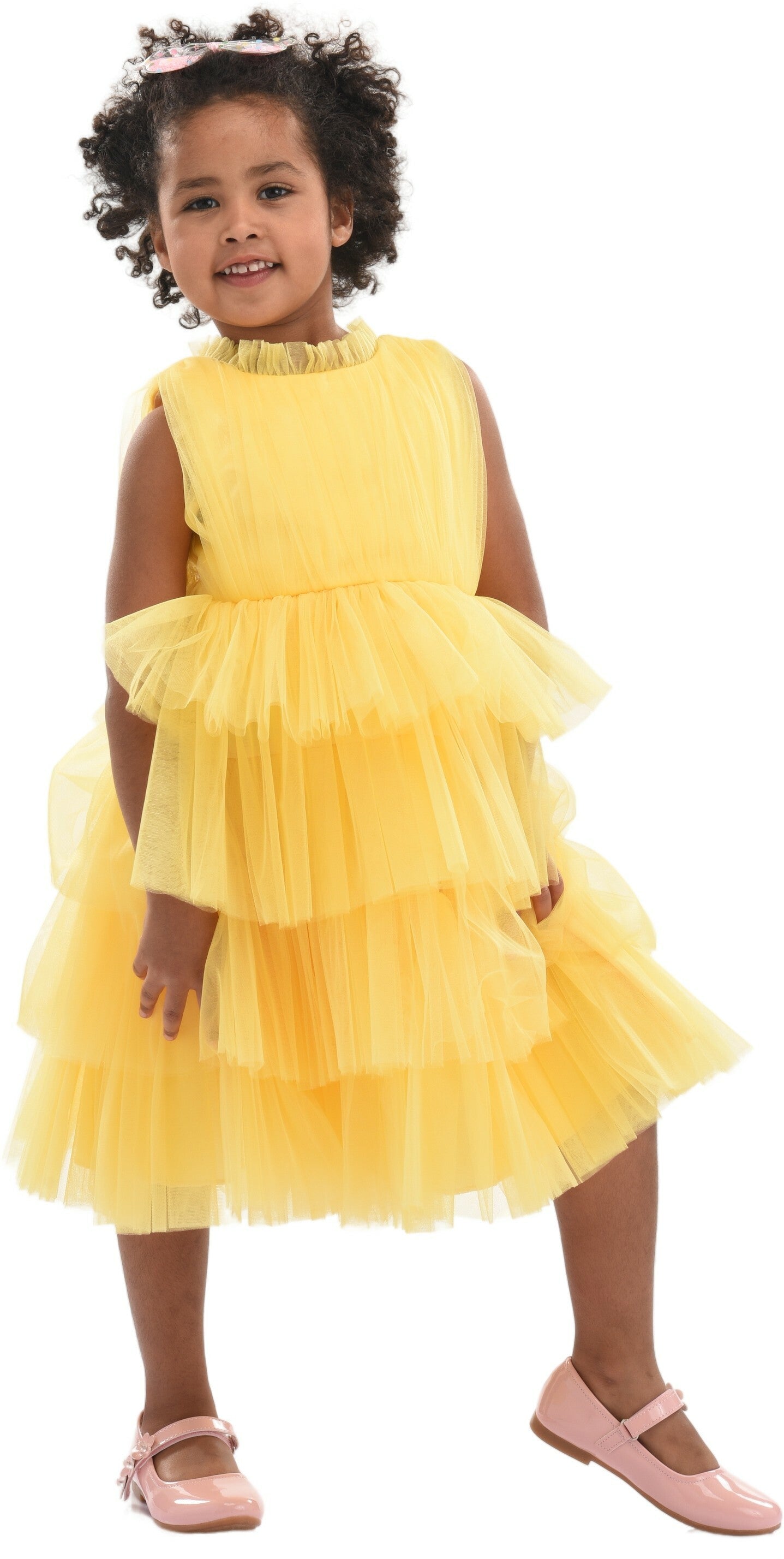 The Yellow Farvue Sleeveless Tiered Tulle Dress for kid girls from Tulleen combines lightness and elegance, making it perfect for any special occasion. This dress features a lightweight tulle sleeveless bodice that ensures comfort and freedom of movement.
